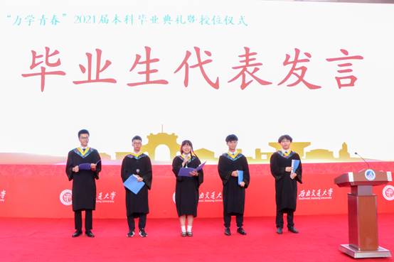胡冰晖、王烽、牛国浩、陆豪、秦明浩同学作为第一届飞行器设计与工程专业的毕业生代表发言,畅想在未来如何将个人发展融入国家民族发展,回忆了在交大四年中印象最深刻的一些事情,表达了对学校和学院的真挚感谢。