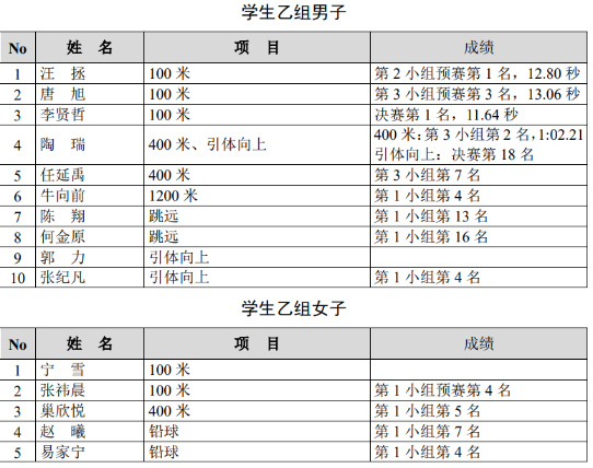 我院学生团体总分排列乙组第7名,团体项目获“跳绳接力”第1名、“大风车”第2名、4*400混合接力第5名、10*50米混合接力第6名、女子4*100接力第6名成绩,并在多项运动中夺得佳绩。