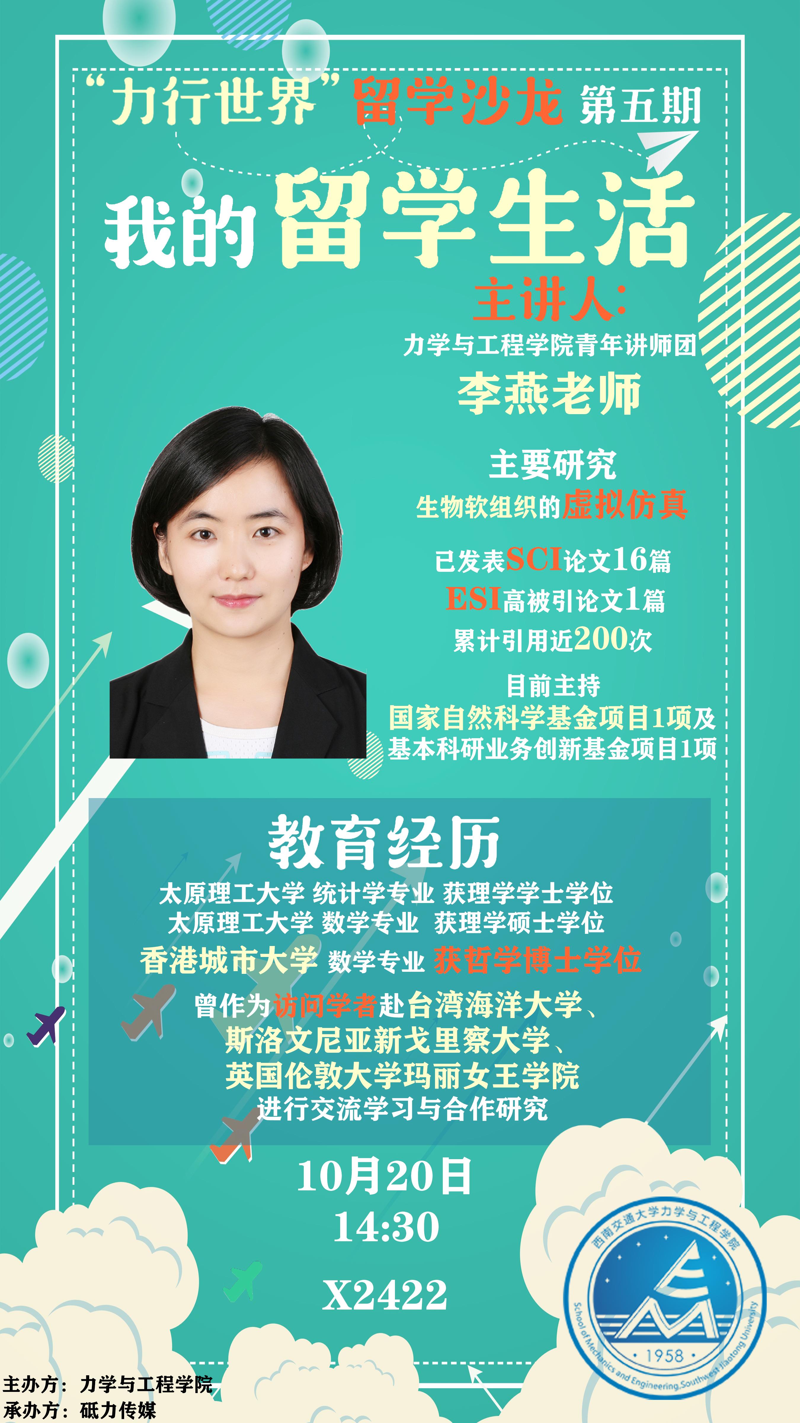 10月20日下午,力学与工程学院“力行世界”留学沙龙第五期活动在X2422教室举行。本次沙龙特邀力学学院“青年讲师团”成员李燕老师为同学们分享她的求学经历。学院党委书记栗民老师、学院学工组张容华老师及学院100余名同学参加了本次活动。